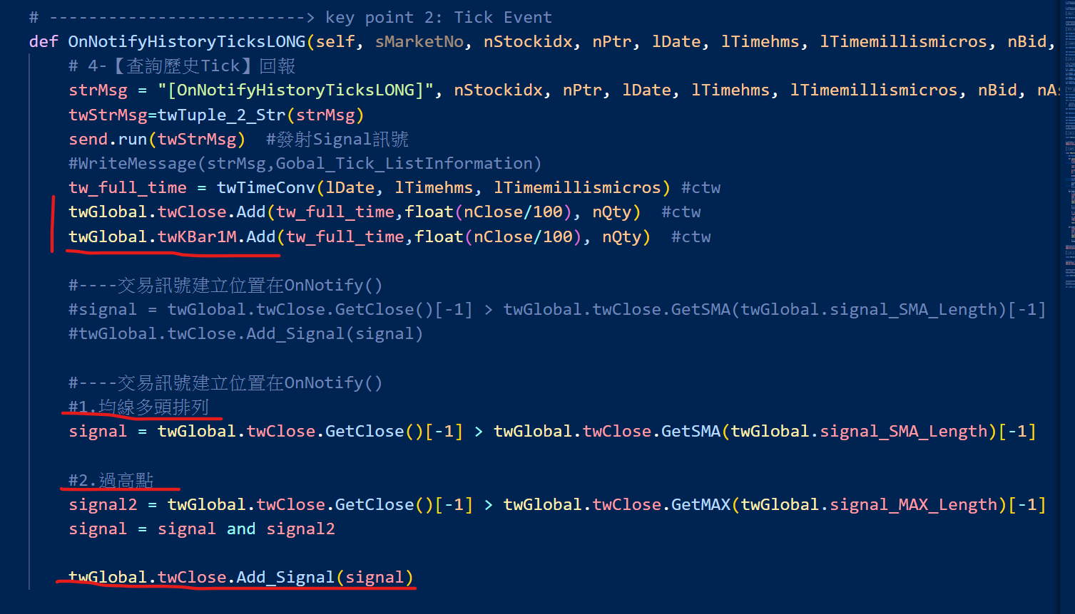 3. (tw函數2) API事件回傳用,tw回傳處理類函數(顯示回傳訊息,存Tick值,畫Tick圖,計算指標,產生訊號,自動下單)【III.2】